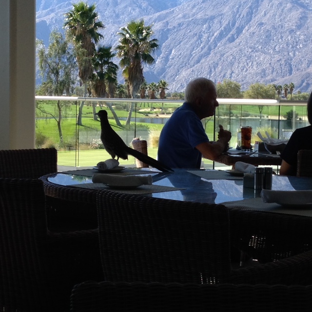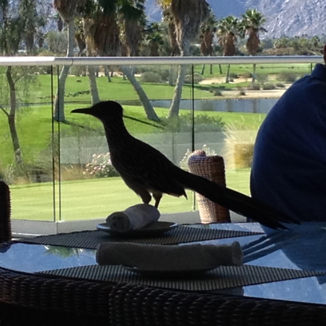 John: 3:15 Nov. 11. We were joined for lunch by this roadrunner at the Escena golf course. He posed for us. Bill also convinced me (Mr. Gullible) that Reese Witherspoon is sitting down at the end of the veranda. But then he confessed that Danelle gets after him for mistakenly identifying movie stars and other celebrities who are in reality just people like you and me. That’s him in the picture. You can tell from his glasses.