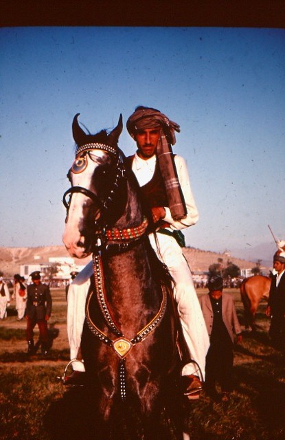 2) Buzkashi players at Jeshyn in the Ghazi Stadium, circa 1964. The rider on the white horse is carrying a dead calf and will attempt to drop it in a circle, but the other team will take no prisoners in trying to stop him. Riders and horses kick and bite. The sport involves hundreds of riders in the northern part of the country, but only two teams of 11 are playing here. Horses train for years to reach this level, as do the riders. On the day I watched, the horses galloped into the crowd and two people were killed.