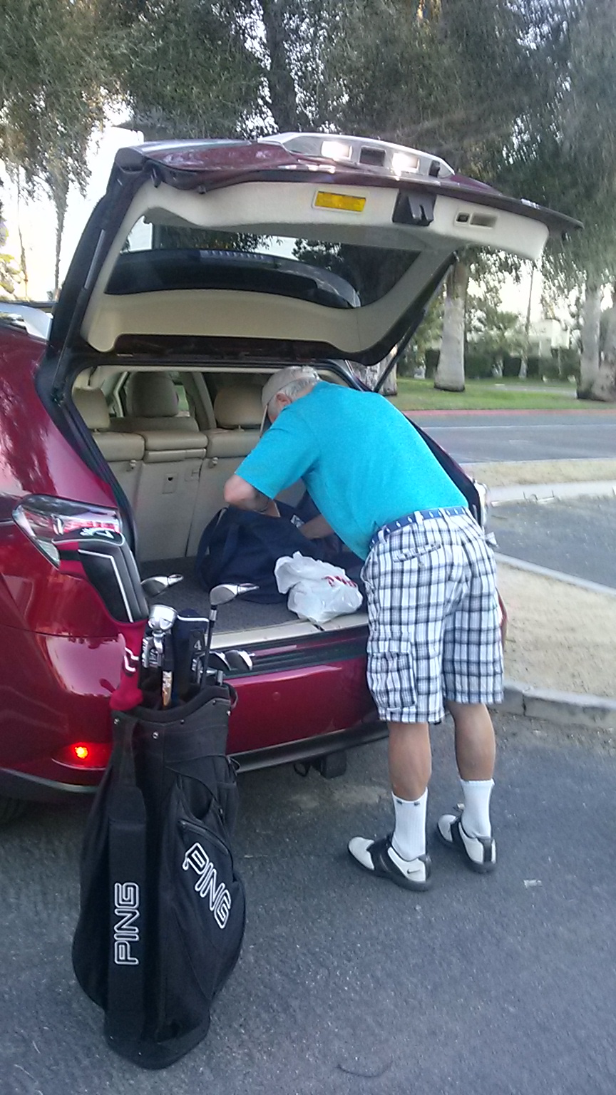 Bill: 6th day….As everyone knows, the fourth day together can get old. Funny quirks become irritants. The question, “Why did you do that?” becomes a reason to question one’s manhood. But on the 6th day, laughs replace sneers and the golf battle becomes reason to join forces and best the common enemy, the golf courses. Here is the most common view of John trying to find something.